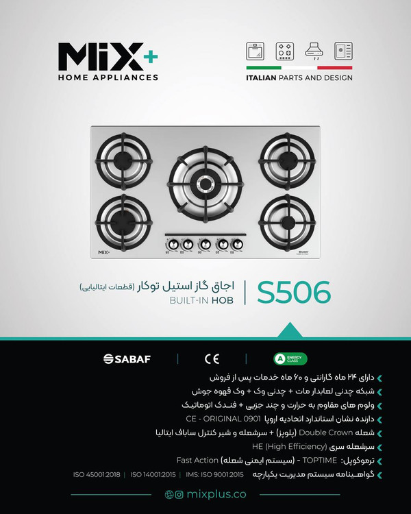 پنج شعله. استیل ۳۰۴ . شیر و سر شعله ساباف ایتالیا . ترموکوپل TO
