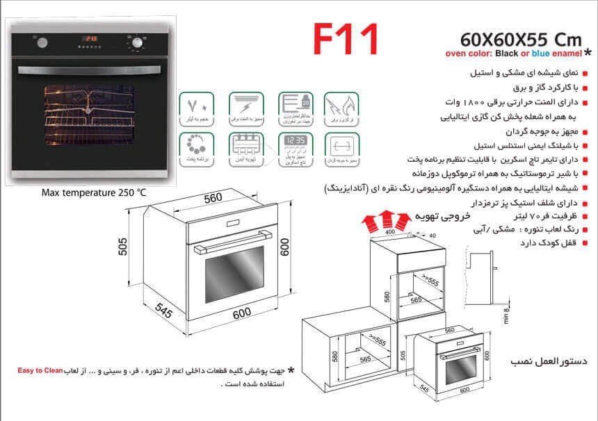 گرمادهی : گریل برقی بالا ( 1800 وات ) + شعله پخش کن گازی پایین