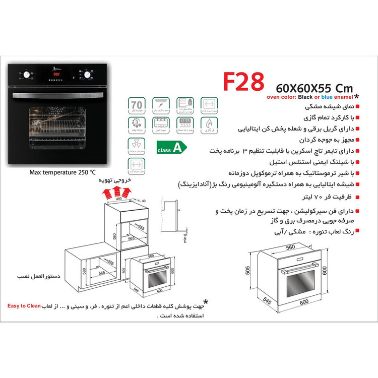 دارای فن داکتی داخلی جهت یکنواخت کردن حرارت دارای ترموکوپل دو زمانه دارای شیلنگ ایمنی استنلس استیل دارای شیر ترموستاتیک و شیشه ایتالیایی