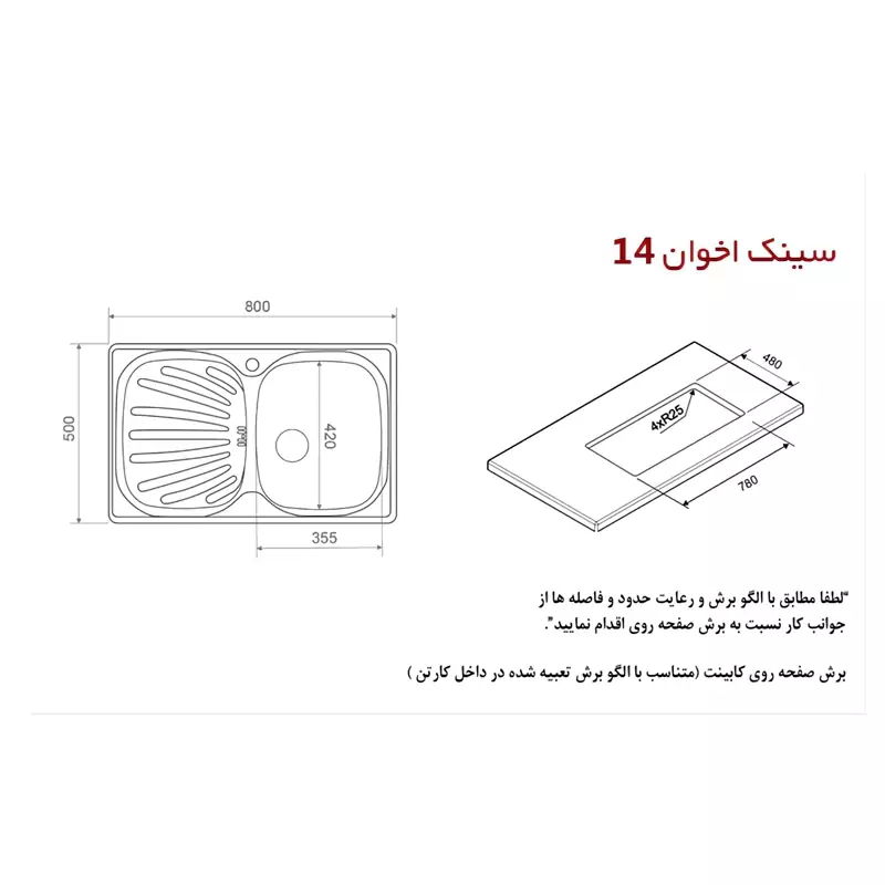 نام محصول : سينک ظرفشویی اخوان کد 14 | Akhavan sink 14 inset نصب به صورت : توکار نوع ورق استیل : استیل ضد زنگ Aisi – 304 تعداد و نوع لگن : یک لگن – بزرگ ضخامت ورق استفاده شده : 0/8 میلیمتری ابعاد خارجی محل نصب : 80 در 50 سانتی متر عمق لگن : دارای لگن عمیق 19 سانتی متر سمت لگن ها : قابلیت انتخاب لگن چپ و راست در هنگام سفارش لوازم سیفون: دارد به همراه زیراب فانتزی بزرگ لوازم جانبی همراه : سبد ، تخته گوشت می باشد. امکان اضافه شدن تخلیه لباسشویی : دارد سوراخ نصب شیر : دارد – امکان نصب شیرالات با وزن متوسط نوع اتصال سینک به کابینت : بست فلزی نوع زیراب استفاده شده : دایره با تخلیه سریع نوع طراحی لگن : طراحی لگن ها فانتزی کشور کارخانه سازنده : ایران مدت گارانتی : 10 سال محصولی پر فروش,با کیفیت بالا,خوش قیمت بادوام با بسته بندی شکیل و کارتن که سالم به دست شما میرسد ارسال به سراسر کشور فقط با باربری (هزینه ارسال بر عهده مشتری میباشد ) ارسال به تهران و اطراف تهران با اسنپ.پیک و... (هزینه ارسال بر عهده مشتری میباشد )