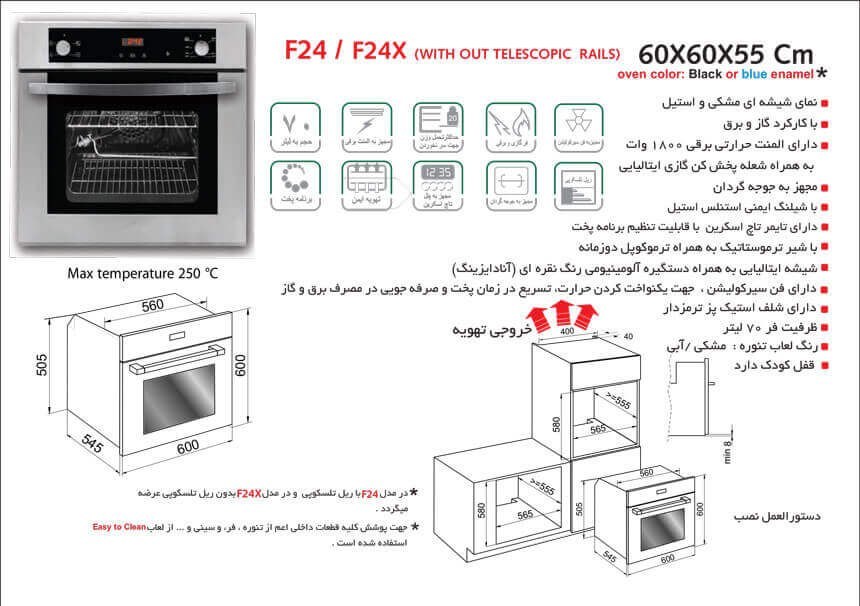 گرمادهی : گریل برقی بالا ( 1800 وات ) + شعله پخش کن گازی پایین